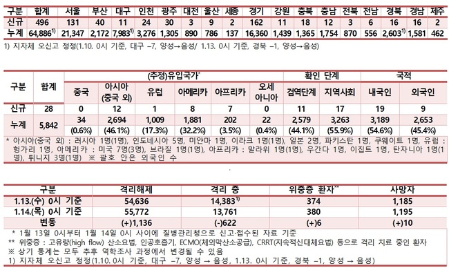 1월 14일 국내 발생 확진자 현황, 해외유입 확진자 현황, 확진자 관리 현황 (자료=질병관리청)