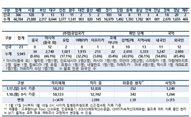 1월 18일 국내 발생 확진자 현황, 해외유입 확진자 현황, 확진자 관리 현황 (자료=질병관리청)