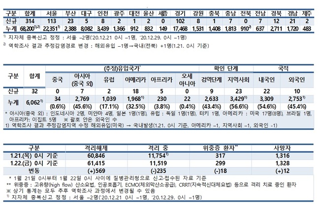22일 국내 발생 확진자 현황, 해외유입 확진자 현황, 확진자 관리 현황 (자료=질병관리청)
