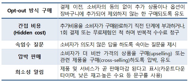 결제 이전 소비자의 동의 없이 추가 상품이나 옵션을 장바구니에 추가하거나, 1회 결제 또는 무료 체험을 가장해 반복적 수수료를 청구하는 행위 등이 이에 해당한다.