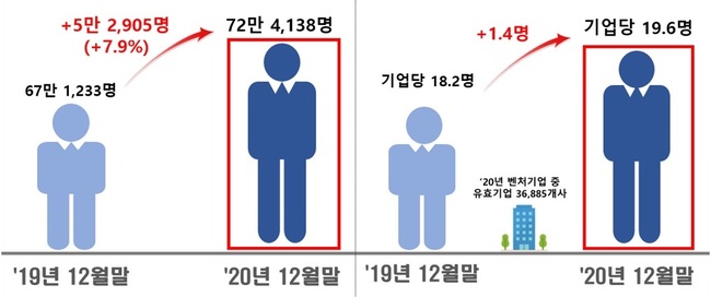 벤처기업 2019년, 2020년 전체 고용 현황 (자료=중소벤처기업부)