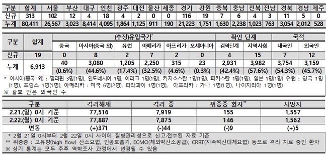22일 기준 코로나19 국내 발생 확진자 현황, 해외유입 확진자 현황, 확진자 관리 현황 (자료=질병관리청)