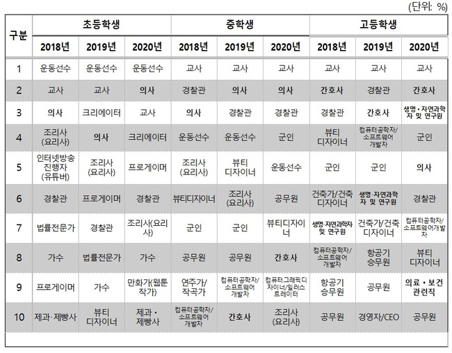 2018년, 2019년, 2020년 학생의 희망 직업 비교 (자료=교육부, 한국직업능력개발원)