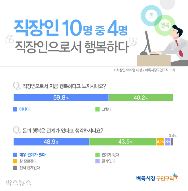 벼룩시장구인구직이 직장인 999명을 대상으로 설문조사한 결과 직장인 10명 중 4명만이 현재 행복하다고 생각하는 것으로 조사되었다. 벼룩시장구인구직이 직장인 999명을 대상으로 설문조사한 결과 현재 행복하다고 생각하는 직장인은 40.2%에 그친 것으로 나타났다.