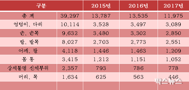 국내 부위별 3도 이상 화상환자 통계현황 (단위/명, 출처=보건의료빅데이터)