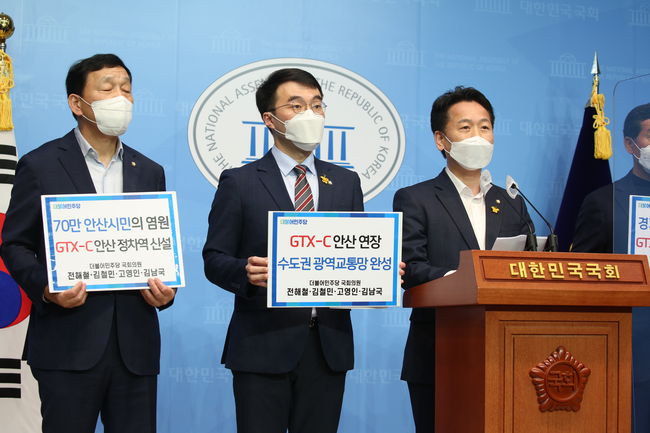 더불어민주당 김철민, 김남국, 고영인 의원이 10일 국회 소통관에서 수도권 광역 급행 철도(GTX)-C 안산 연장 촉구 기자회견을 하고 있다.