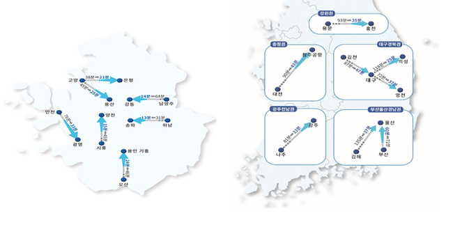 수도권 및 지방 광역철도 투자에 따른 통행시간 변화 (자료=국토교통부)호남고속철도 2단계(광주~목포), 인천발·수원발 KTX 등 사업은 계획대로 진행하고, 서해안 지역 등 고속철도 소외지역에 신규 고속철도 서비스를 제공한다.