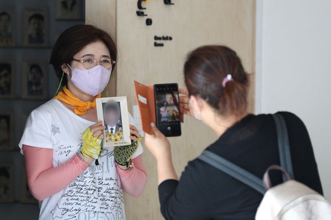 유가족이 광화문 `세월호 기억공간`에 보관되던 세월호 참사 희생자의 사진을 들고 사진을 찍고 있다.