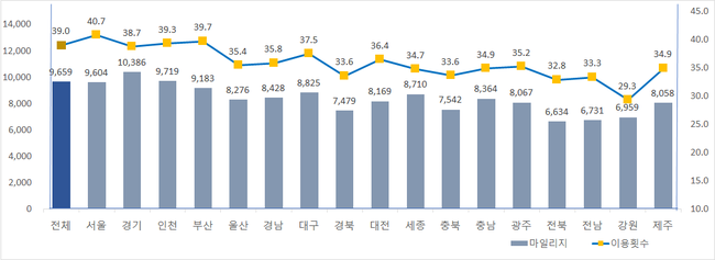 지역별 알뜰교통카드 이용회수 통계 (자료=국토교통부)알뜰교통카드 이용회수도 월 평균 39회로 2020년 37.9회 대비 1.1회 증가했고, 지역별로는 서울, 부산, 인천, 경기지역 순으로 많았으며, 마일리지 할인을 많이 받은 곳은 대중교통비 부담이 큰 경기 1만 386원, 인천 9719원, 서울 9604원 순이다.