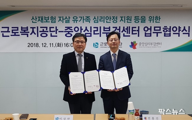 중앙심리부검센터와 근로복지공단이 지난 11일 중앙심리부검센터에서 ‘자살 유가족 심리지원 업무연계를 위한 업무협약’을 체결했다고 밝혔다.
