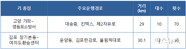 신설노선 운행계통안이번에 신설한 2개 노선은 수도권 택지개발지구 조성(고양 킨텍스 1·2단계 사업지구, 김포 한강지구), 킨텍스 연간 방문객 증가 등으로 서울 방면 광역교통 이용수요 증가와 기존 대중교통 여건을 종합적으로 고려하여 선정되었다.