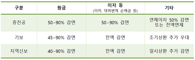 중소벤처기업진흥공단을 비롯해 3개 정책금융기관은 사업 실패 등으로 채무변제에 어려움을 겪는 채무자의 원금과 이자를 감면해주기로 결정했다.