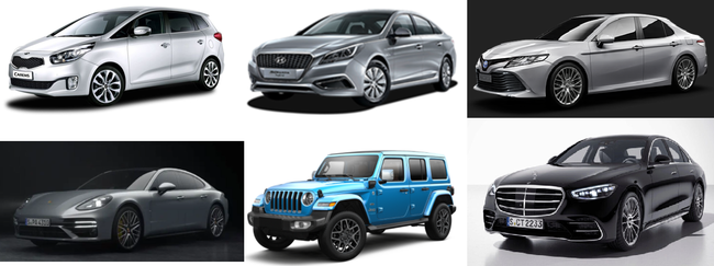 리콜 대상 자동차 시계 방향으로 기아 카렌스, 현대자동차 쏘나타 하이브리드, 한국도요타자동차 캠리, 메르세데스벤츠코리아 S 450 4MATIC, 스텔란티스코리아 짚 랭글러 플러그인 하이브리드, 포르쉐코리아 파나메라 (자료=국토교통부)기아에서 제작·판매한 카렌스 1만 8944대는 LPG 연료펌프 내부의 연료를 공급 및 차단하는 밸브 제조 불량으로 주행 중 연료 공급이 차단되고, 이로 인해 시동이 꺼질 가능성이 확인돼 자발적 리콜에 들어간다.