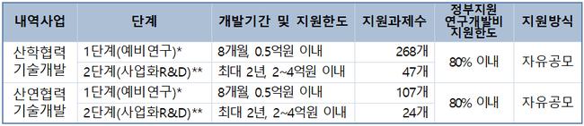 지원분야와 유형은 자유공모 형태로 중소기업이 필요로 하는 모든 분야의 기술 및 제품개발 지원이 가능하다. 또한, 사업성과 제고를 위해 1단계 예비연구(PoC, Proof of Concept)와 2단계 사업화 연구개발(R&D)을 단계적으로 지원한다.