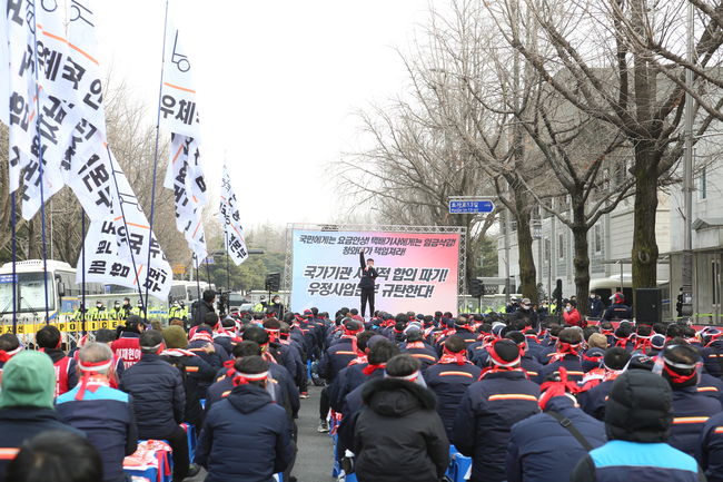 전국택배노조 우체국본부는 10일 오후 서울 종로구 청운동 효자치안센터 앞에서 `사회적합의 불이행 규탄 결의대회`를 열었다.