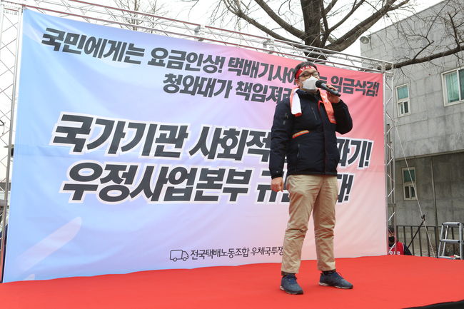 전국택배노조 우체국본부는 10일 오후 서울 종로구 청운동 효자치안센터 앞에서 `사회적합의 불이행 규탄 결의대회`를 열고 "청와대는 하루 빨리 우정사업본부(이하 우본)의 모순된 입장을 정리하고 우체국 택배 현장을 정상화할 수 있도록 조치해야 한다"고 주장했다.