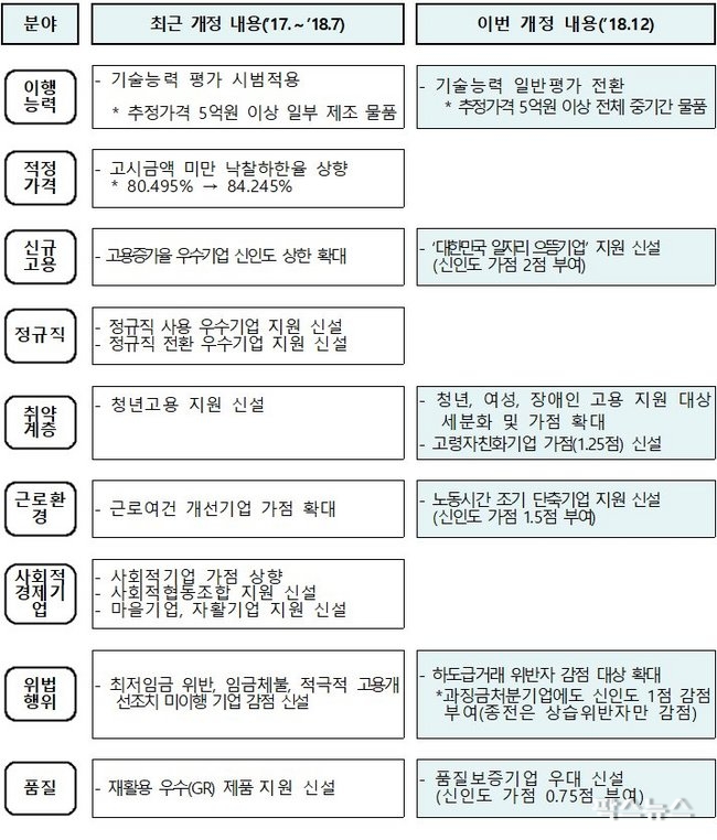 이번 심사기준 개정으로 근로여건 개선, 취약계층 고용 우수기업 등 사각지대 지원이 강화되며 상대적으로 고액 구간인 5억원 이상에 대한 기술능력 평가 강화로 기업의 기술력 향상을 유도한다.