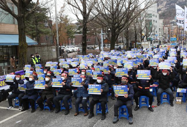 전국택배노동조합 우체국 투쟁본부는 17일 오후 서울 종로구 청와대 인근 효자치안센터 앞에서 택배노동자 과로사 방지를 위한 사회적 합의 이행을 촉구하며 `무기한 단식농성 돌입 회견 및 결의대회`를 개최했다. 이날 택배노조 우체국 본부 대표 15인은 무기한 단식농성에 돌입했다.