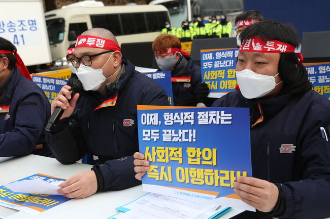 우체국 투쟁본부는 결의대회에 앞서 기자회견을 진행하며 우정사업본부의 사회적 합의 이행을 촉구했다.