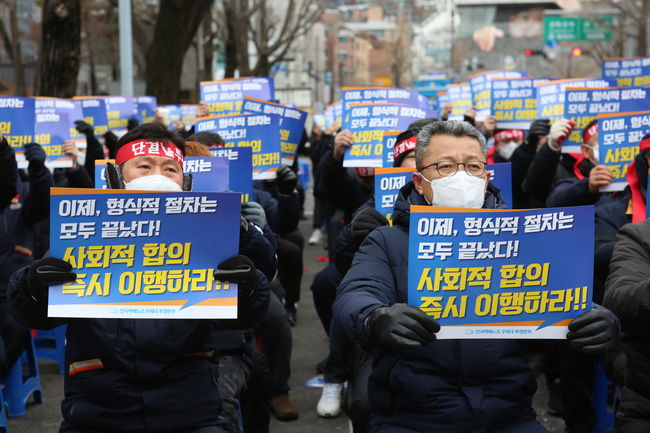 전국택배노동조합 우체국 투쟁본부 조합원들이 결의대회에 참석해 우정사업본부의 사회적 합의 이행을 촉구하는 피켓을 들고 있다.