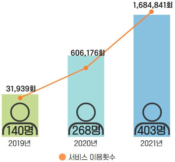 서비스 이용 추이 (자료=국민권익위원회)그 결과 매년 민원 빅데이터 신규 이용자와 서비스 이용 횟수는 점차 늘어나고 있다. 특히 2021년에는 403명의 개인 또는 기관에서 총 168만 4841회의 Open API 서비스를 이용한 것으로 나타났다.