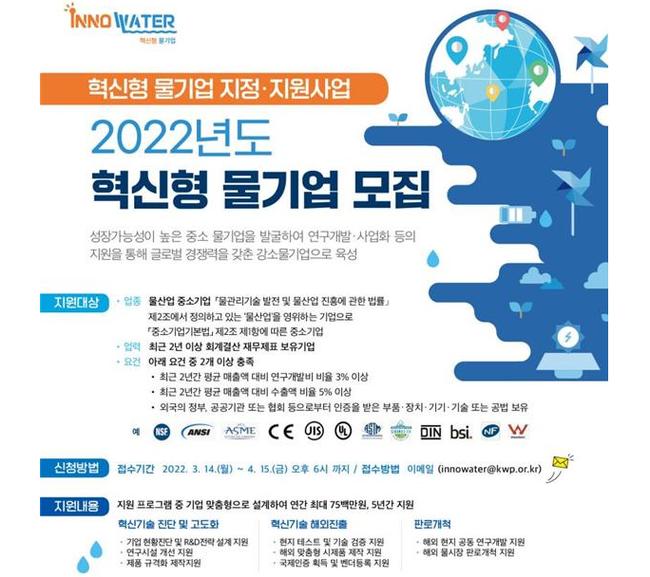 올해는 3월 14일부터 4월 15일까지 혁신형 물기업 지정 공모를 진행하며, 혁신형 물기업 지정을 희망하는 기업은 한국물산업협의회에 신청서를 제출하면 된다.