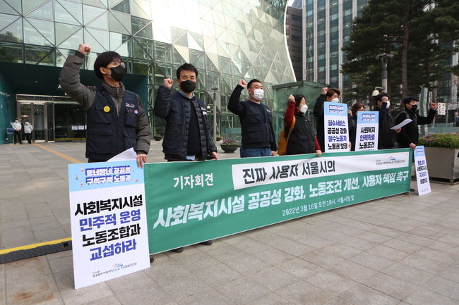 공공운수노조 사회복지지부는 16일 오전 서울시청 앞에서 ‘진짜 사용자 서울시의 사회복지시설의 공공성 강화, 노동조건 개선, 사용자 책임’ 촉구 기자회견을 가졌다.