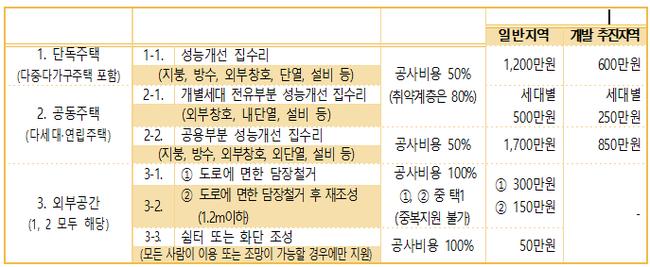 구체적으로 살펴보면 집수리 보조·융자 사업의 경우 주택성능개선지원구역 내 노후 저층주택의 경우 지원 가능하며, 그 외 노후주택의 경우에는 이자 지원 사업을 통해 지원한다. 집수리 보조금은 공사비용의 50% 이내에서 단독주택에 최대 1,200만 원까지 지원하며, 융자금은 공사비용 80% 이내에서 최대 6,000만 원까지 지원한다.