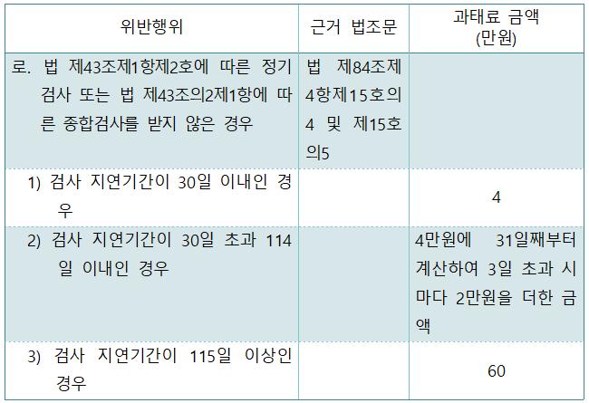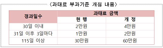 이번에 시행되는 개정 법령에서는 자동차검사 지연 과태료의 부과금액이 2배 상향 조정된다. 또한, 검사 명령을 이행하지 아니한 지 1년이 경과할 경우 운행정지 처분을 받게 되며, 이를 이행하지 않고 계속 운행할 경우 1년이하 징역 또는 1,000만 원 이하의 벌금이 부과될 수 있고 자동차 직권말소까지 가능하도록 제재가 강화된다.