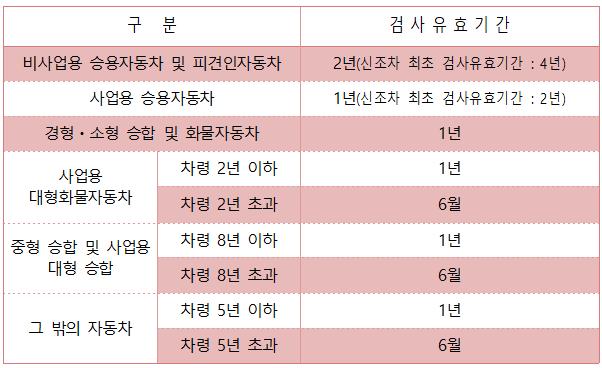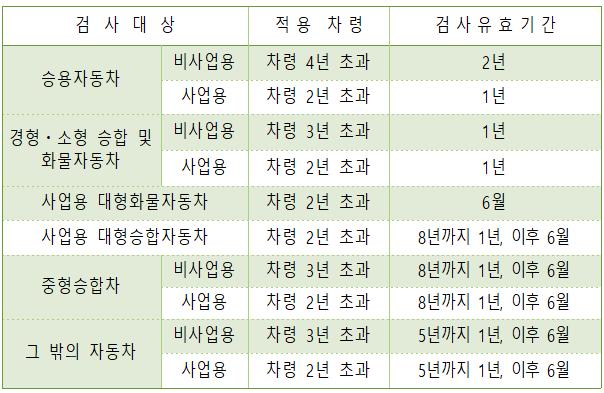 자동차검사는 자동차 결함으로 인한 교통사고를 예방하여 시민의 생명과 재산을 보호하기 위한 규정으로 차량 소유자는 의무적으로 받아야 한다. 자가용은 신차 등록 후 4년, 그 이후에는 2년에 한 번씩, 영업용·승합·화물 자동차는 차종과 차령에 따라 1년 또는 6개월에 한 번씩 검사를 받아야 한다.