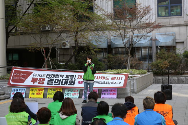 전국학습지산업노동조합 대교지부는 15일 서울 관악구 대교타워 앞에서 `단체협약 체결 투쟁 결의대회`를 진행했다. 참가 노조원들은 재계약심사제도 폐지를 주장하면서 "재계약 실시 웬말이냐? 더불어 상생하자" "조합원 힘으로 단체협약 제결하자" 등의 구호를 외쳤다.