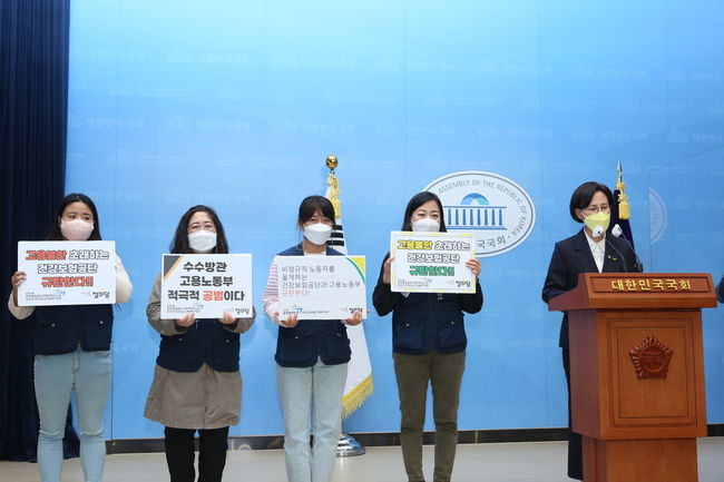 민주노총 공공운수노조 국민건강보험고객센터지부 관계자들은 3일 국회 소통관에서 `고용불안을 초래하는 국민건강보험공단과 이를 방조하는 고용노동부 규탄 기자회견`을 가졌다.이들은 “건강보험공단은 고객센터 업무를 민간위탁으로 맡겼을 당시, 업체가 변경될 때는 기존 인력을 최대한 고용 승계한다는 원하청 계약 특수조건에 명기했었으나 이번 2022년 계약 특수조건에 ‘고용 승계는 민간위탁 업체 간의 변경에만 해당한다’라는 문구를 넣어 정규직 전환 가이드라인의 취지와는 다르게 비정규직 상담노동자의 고용불안을 초래했다”고 지적했다.