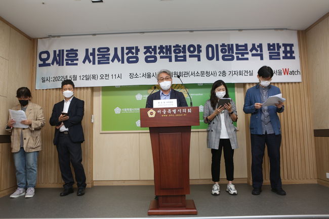 경제정의실천시민연합 등 시민단체 관계자들은 12일 서울 중구 서소문동 서울시의회 의원회관에서 오세훈 서울시장 정책협약 이행 분석 발표 기자회견을 가졌다.