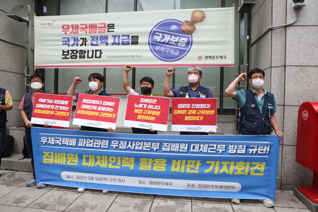 전국민주우체국본부는 16일 서울 종로구 광화문우체국 앞에서 기자회견을 열고 우정사업본부(우본)가 오는 18일 예정된 우체국택배노조의 파업에 집배원을 대체 인력으로 투입하겠다는 지침을 내리려는 조치에 강력 반발하고 나섰다.민주우체국본부는 기자회견에서 “우본은 우체국택배노조의 파업 등 쟁의행위가 있을 때마다 반복하는 집배원 대체 근무 방침을 철회하라”고 촉구했다.