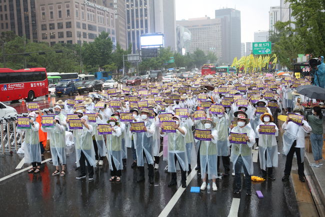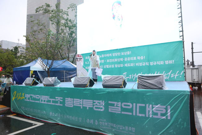 민주노총 전국보건의료산업노동조합은 23일 장마를 알리는 폭우 속에 서울 광화문 동화면세점 앞에서 `2022 보건의료노조 총력투쟁 결의대회`를 열었다.