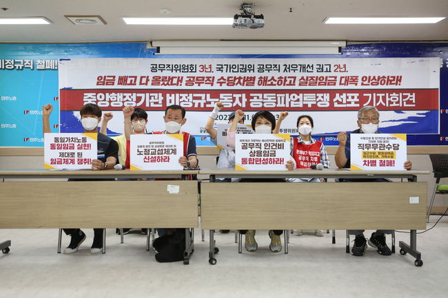 민주노총 전국공공운수사회서비스노조는 11일 서울 중구 민주노총 회의실에서 `중앙행정기관 비정규직노동자 공동파업 투쟁 선포 기자회견`을 열고 처우 개선 등을 요구하며 공동파업을 선포했다.기자회견에서 노조는 ▲ 실질임금 대폭 인상 및 최저임금 산입범위 정상화 ▲ 공무직위원회 및 노정 교섭기구 상설화 ▲ 국가인권위원회 권고안 이행 등을 요구했다.