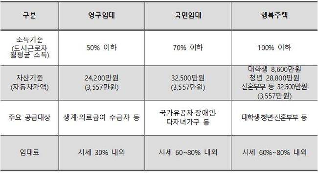 공공임대주택은 시세 보다 저렴하게 안정적으로 거주 가능한 주택으로, 수급자 등에게 시세 30% 이하 수준으로 공급되는 영구임대주택, 다양한 계층에게 공급되는 국민임대주택, 청년·신혼부부 등 청년층에게 주로 공급되는 행복주택 등으로 구분된다.