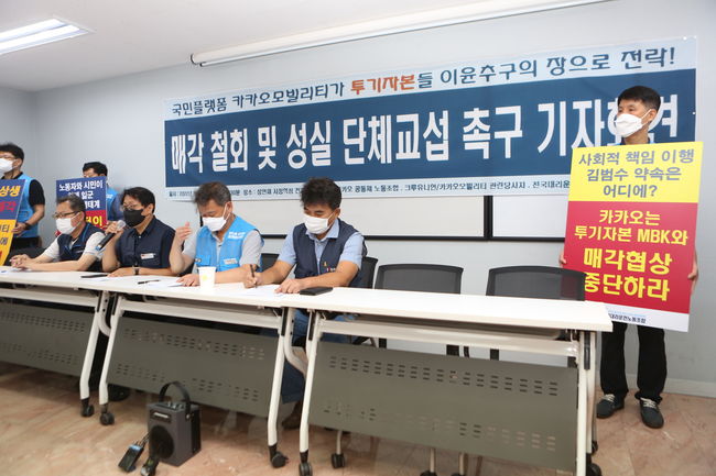 카카오 공동체 노동조합 크루유니언과 전국대리운전노동조합은 10일 서울 중구 상연재에서 `카카오모빌리티 매각철회 및 성실 단체교섭 촉구` 기자회견을 열고 `카카오는 카카오모빌리티 매각유보에서 나아가 MBK와 거래를 중단하고 매각을 철회해야 한다`고 밝혔다.카카오가 거센 사회적 반발에 부딪혀 국내 최대 사모펀드 MBK에 카카오모빌리티를 매각하는 것을 잠정 유보한 가운데 이들 노조가 매각 철회를 주장하고 나선 것이다.