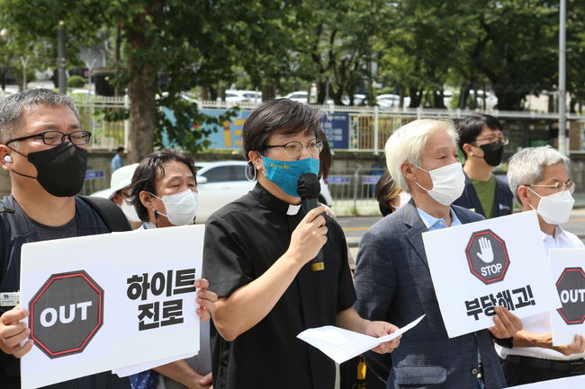 민주노총 공공운수노조 등 53개 노동시민단체들은 18일 서울 용산구 대통령집무실 앞에서 `윤석열 정부의 자본 편들기와 하이트진로 노조파괴 행위 중단 촉구` 기자회견을 진행했다.