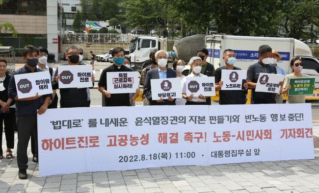 민주노총 공공운수노조 등 53개 노동시민단체들은 18일 서울 용산구 대통령집무실 앞에서 `윤석열 정부의 자본 편들기와 하이트진로 노조파괴 행위 중단 촉구` 기자회견을 진행했다.이들 시민단체들은 이날로 사흘째 접어든 화물연대 노조원들의 하이트진로 본사 점거사태의 신속한 해결을 위해 사측이 노조를 상대로 한 손해배상을 철회하고, 정부 역시 수수방관한 것이 아니라 실효성 있는 대책을 마련해야 한다고 주장했다.