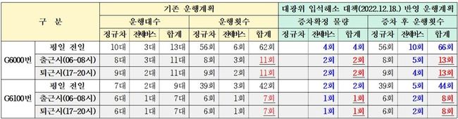 국토교통부 대도시권광역교통위원회는 16일 수도권 33개 노선의 출퇴근 시간대 운행 횟수 확대를 발표했다. G6000번 광역버스는 기존 출‧퇴근 시간대 각각 11회 운행에서 13회로 증차했고, G6100번 광역버스는 기존 출‧퇴근 시간대 각각 7회 운행에서 8회로 증가했다.