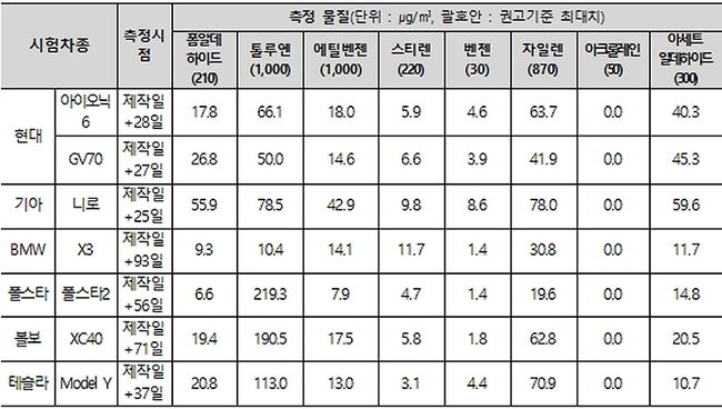 측정대상 자동차의 주요 차종별 실내공기질 조사결과 (국토교통부 제공)