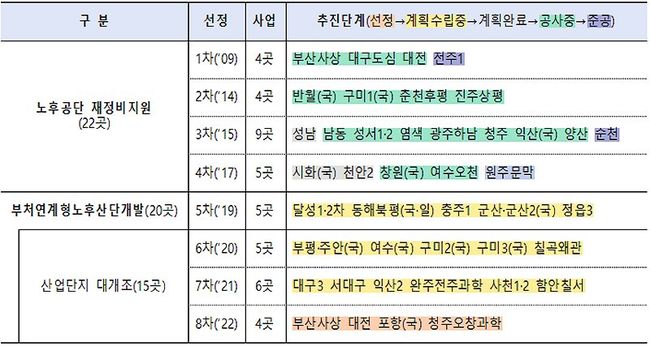 국토교통부는 노후산단 재생사업을 추진 중인 42곳 산업단지를 대상으로 제안서를 제출받아 2곳을 신규 선정할 계획이다.