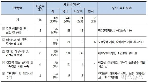 정주생활지원금 지원 등 주민 생활안정 및 삶의 질 향상 사업 5개, 76억원, 노후주택 개량사업 등 주거환경 조성사업 2개, 33억원, 해수담수화시설 신축 등 기반시설 확충 사업 8개, 166억원, 해삼섬 조성사업 등 일자리 및 소득창출 기반 사업 6개, 30억원 등을 지원한다.