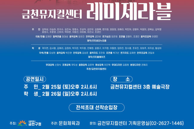 2월 25일 토요일 오후 2시와 6시에는 주민들이 출연하는 레미제라블을 감상 가능하다. 2월 26일 일요일 오후 2시와 6시에는 청소년들이 선보이는 레미제라블을 볼 수 있다. 공연을 관람하고자 하는 주민은 금천뮤지컬센터에 전화로 예약하면 된다.