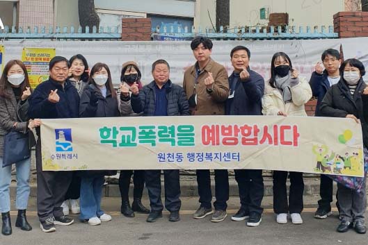 수원시 원천동행정복지센터는 16일 관내 청소년지도위원과 함께 청소년 비행행위를 선제적으로 예방하기 위한 학교폭력예방캠페인을 진행했다.
