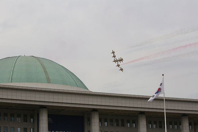 공군 특수비행팀 블랙이글스가 여의도 상공을 비행하고 있다.