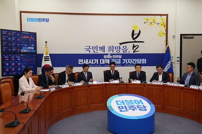 19일 오후 국회에서 열린 `전세사기 대책 긴급 기자간담회`에서 더불어민주당 정책위원회 위원들이 간담회를 진행하고 있다.