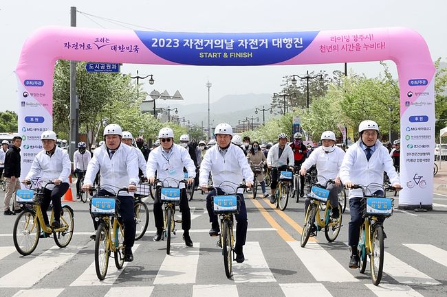 한창섭 행정안전부 차관이 지난 4월21일 오전 경북 경주시 황성공원에서 열린 2023 자전거의 날 행사에서 자전거 대행진 출발선에서 라이딩을 하고 있다.