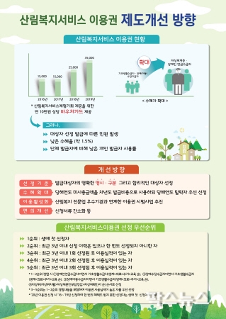 산림청은 행정의 투명성을 높이기 위해 모든 개선내용을 ‘2020년도 산림복지서비스이용권 제공계획’에 담아 올 12월 중순 공표할 계획이다.